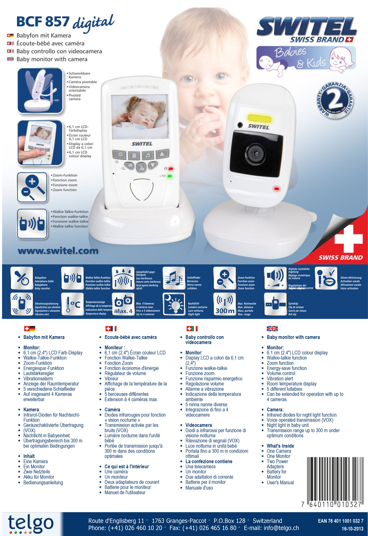 Для домов или больших квартир незаменимой функцией является возможность подключения нескольких камер к одному родительскому блоку. Хотя три детских блока уже включены в комплект, в будущем можно приобрести и подключить еще одну камеру. Просматривать изображение с каждой из камер можно по требованию или в автоматическом режиме переключения между выбранными детскими блоками. Таким образом значительно упрощается присмотр за ребенком, если мониторинг часто необходим в нескольких комнатах или при наблюдении за несколькими детьми. А благодаря возможности всех блоков видеоняни Switel BCF857 работать без подключения к розетке, её удобно использовать на даче или во время прогулок на улице.