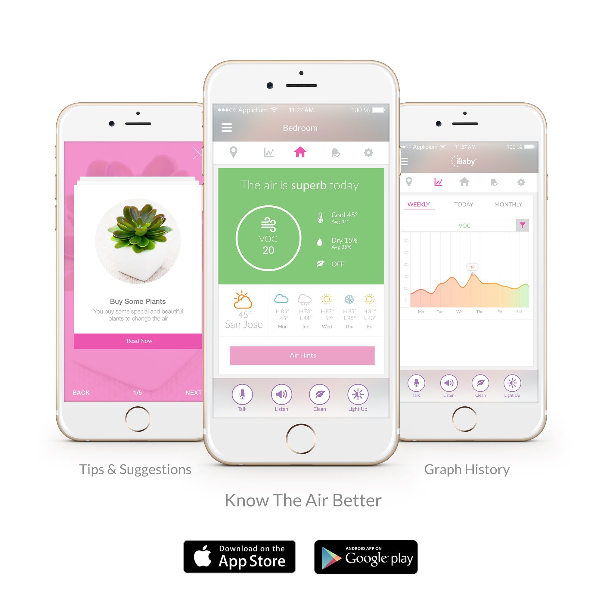 Советы по качеству воздуха. Чтобы помочь оптимизировать качество воздуха в детской комнате для благополучия вашего ребенка, iBaby Air A1 посылает советы, основываясь на состоянии окружающей среды. Советы могут быть достаточно простыми и доступными в любой ситуации, например, открыть окна, приобрести растения, или сократить использование определенных продуктов.