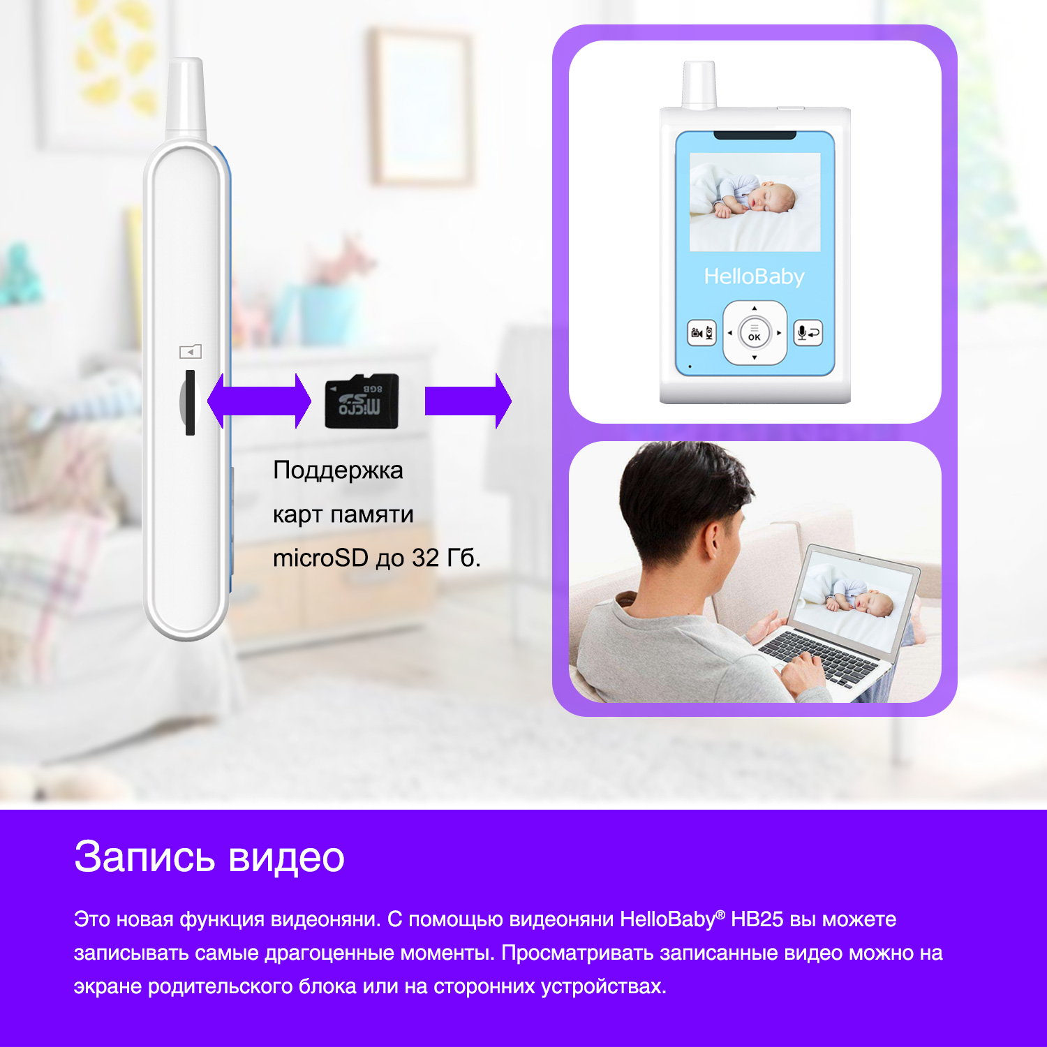 С помощью видеоняни можно удаленно записывать видео или создавать фотографии, которые будут записаны на карту памяти.