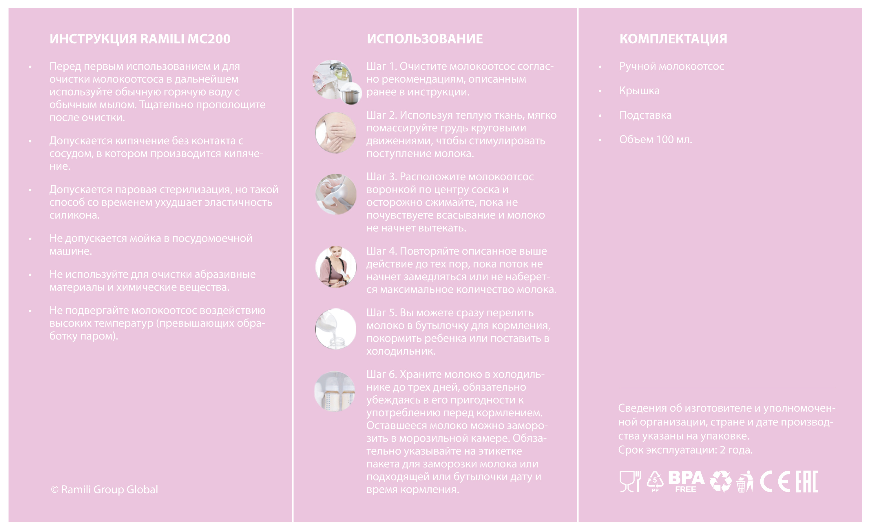 Перед первым использованием и для очистки молокоотсоса Ramili® MC200 в дальнейшем используйте обычную горячую воду с обычным мылом. Тщательно прополощите после очистки. Допускается кипячение без контакта с сосудом, в котором производится кипячение. Допускается паровая стерилизация, но такой способ со временем ухудшает эластичность силикона. Не допускается мойка в посудомоечной машине. Не используйте для очистки абразивные материалы и химические вещества. Не подвергайте молокоотсос воздействию высоких температур (превышающих обработку паром).