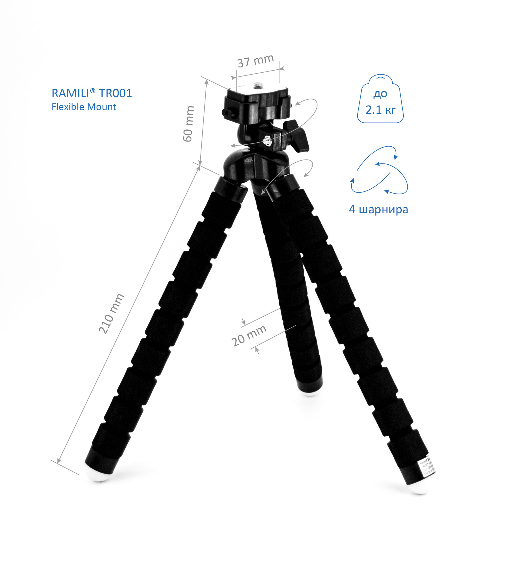 Благодаря удобной конструкции съемного фиксатора треногу можно легко отстегнуть от присоединенного устройства без выкручивания винта простым нажатием на две кнопки по бокам фиксатора площадки. Мягкое и пористое покрытие треноги обеспечивает надежную фиксацию практически с любой поверхностью. Мягкий на ощупь и гибкий штатив-крепление Ramili TR001 изготовлен из высококачественных материалов и обеспечивает надёжную фиксацию. 4 шарнира обеспечивают широкие возможности для точной настройки положения и ракурса зафиксированного на штативе устройства.