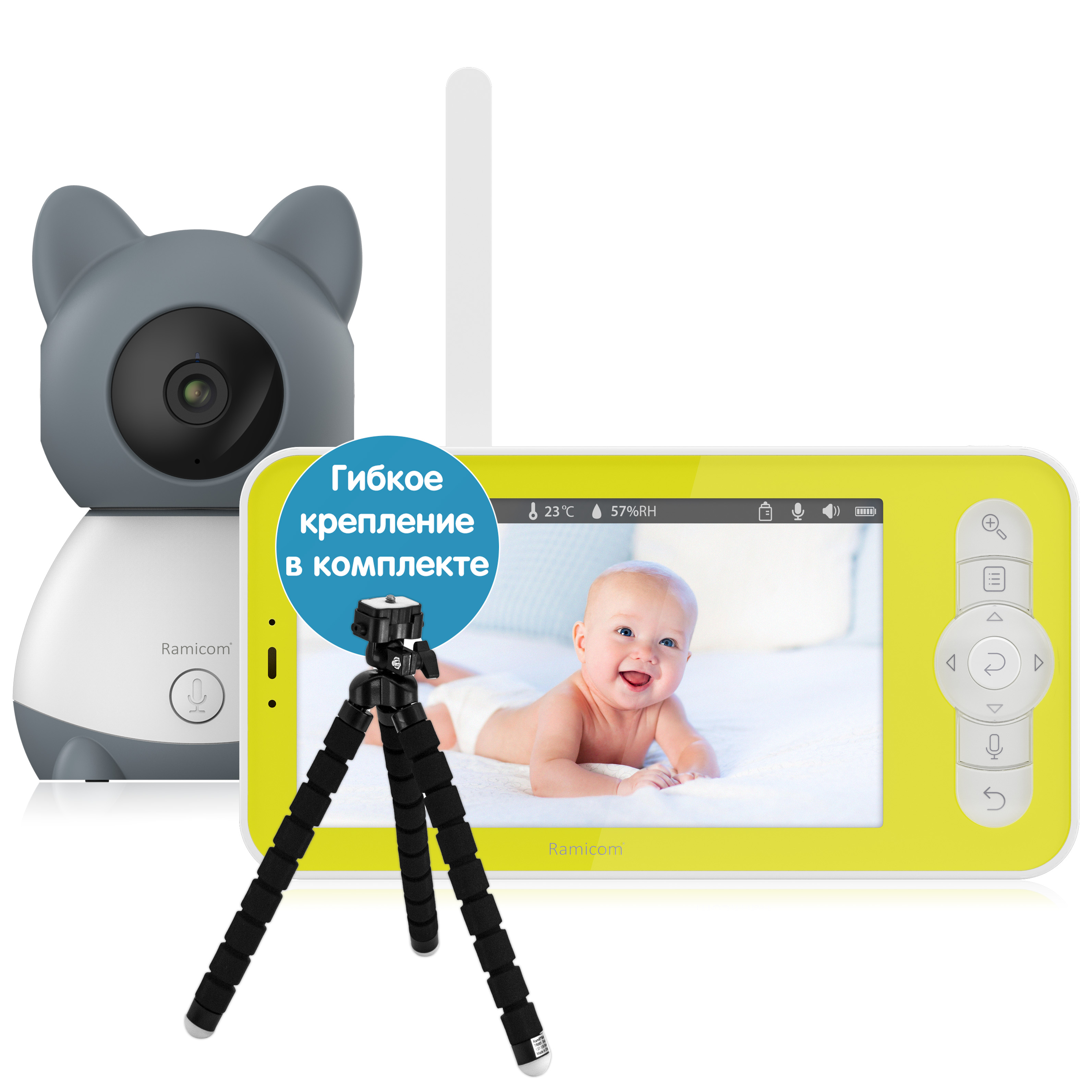 В комплект этой видеоняни уже добавлен гибкий штатив-тренога, с помощью которого камеру можно закрепить почти на любом предмете, например, на элементах мебели. Цифровая видеоняня Ramicom VRC300TR с большим экраном, диагональ которого составляет 12,7 см (пять дюймов) и поворотной камерой, управлять которой можно удаленно. В видеоняне собраны все важные функции, включая датчик движения и возможность подключения к смартфону или планшету для мониторинга из любой точки мира. Видеоняня непрерывно контролирует вашего малыша днём и ночью в режиме 24/7. Может работать в режиме экономии энергии и включаться при обнаружении звука (VOX) или движения вокруг камеры. При этих же событиях поступает пуш-уведомление на смартфоне, если вы подключили видеоняню к домашней сети Wi-Fi. С помощью функции обратной связи вы можете попытаться успокоить малыша на расстоянии, если он расплачется.