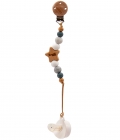 Подвеска с клипсой для соски-пустышки подходит для коляски, кроватки, автокресла т.д. Изготовлена из высококачественных тактильно приятных материалов.