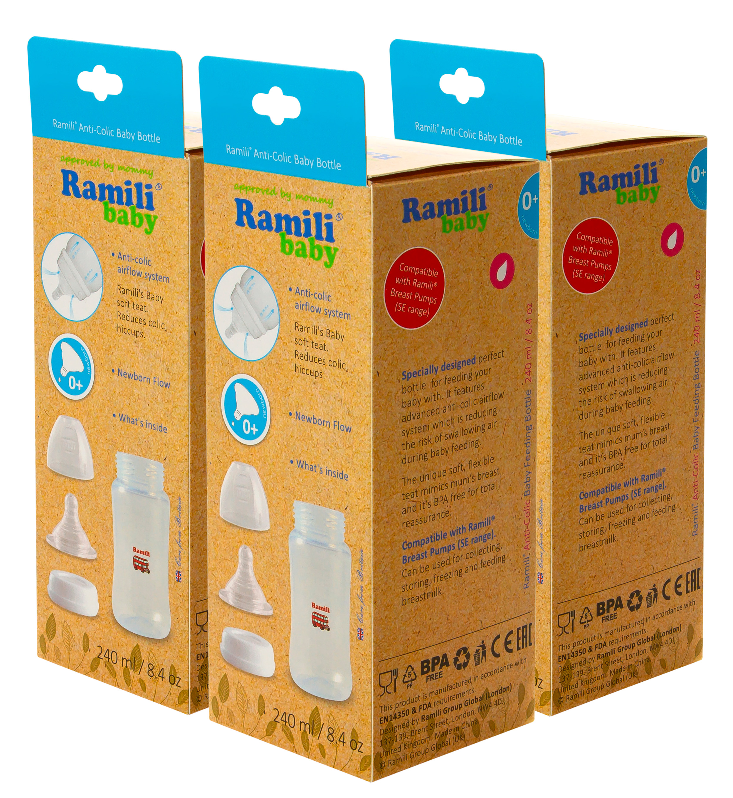 Три противоколиковые бутылочки для кормления Ramili Baby 240MLX3