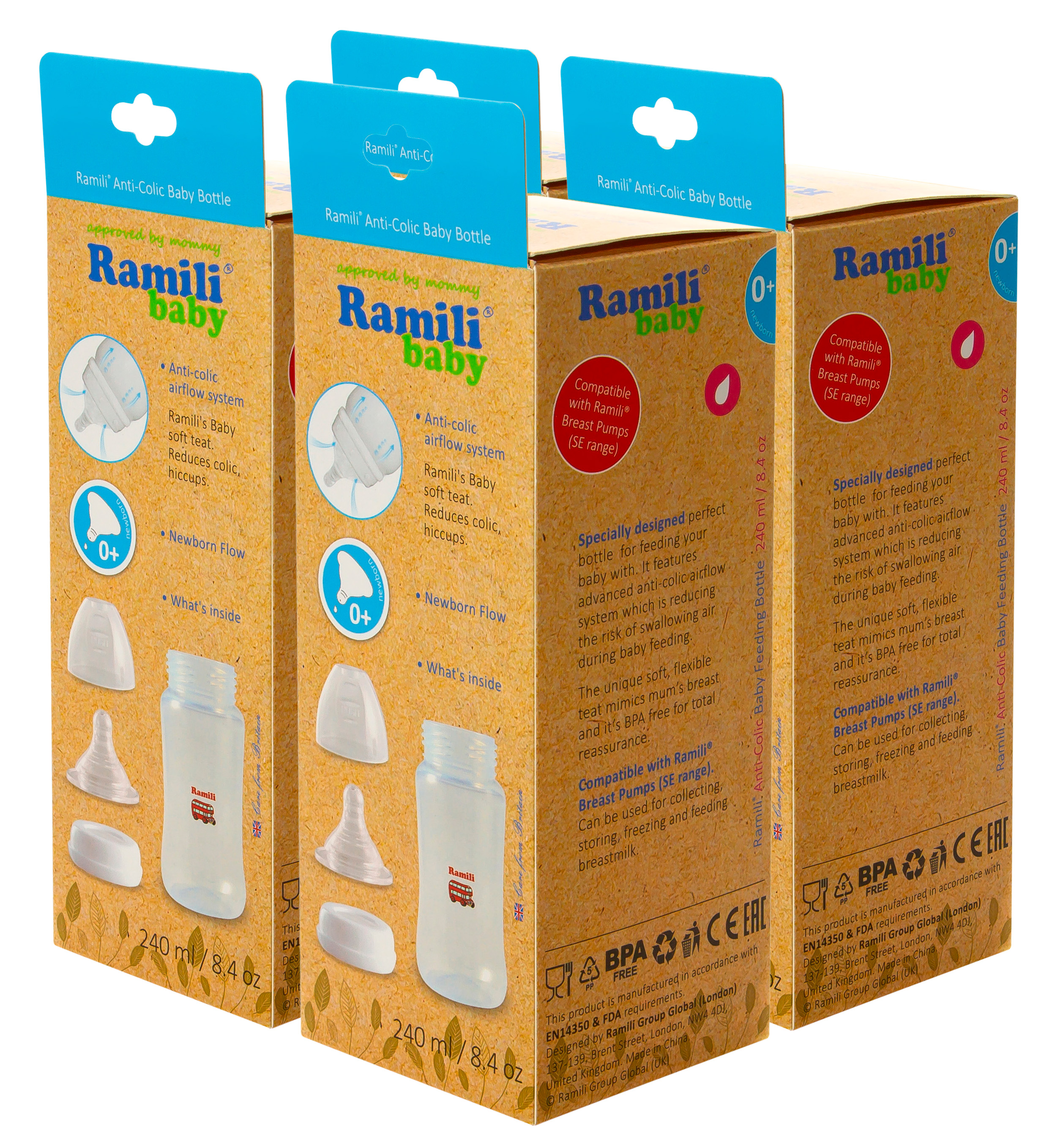 Набор из четырёх детских бутылочет от известной компании-производителя детских товаров. Идеально подходит для кормления малыша. Бутылочка для кормления оснащена передовой противоколиковой системой подачи воздуха внутрь бутылочки, которая при правильном положении (перпендикулярно лицу) исключает заглатывание воздуха во время кормления ребенка, что является причиной возникновения колик. Уникальная мягкая, адаптируемая соска имитирует форму материнской груди. Бутылочка совместима с молокоотсосами Ramili (SE серии).