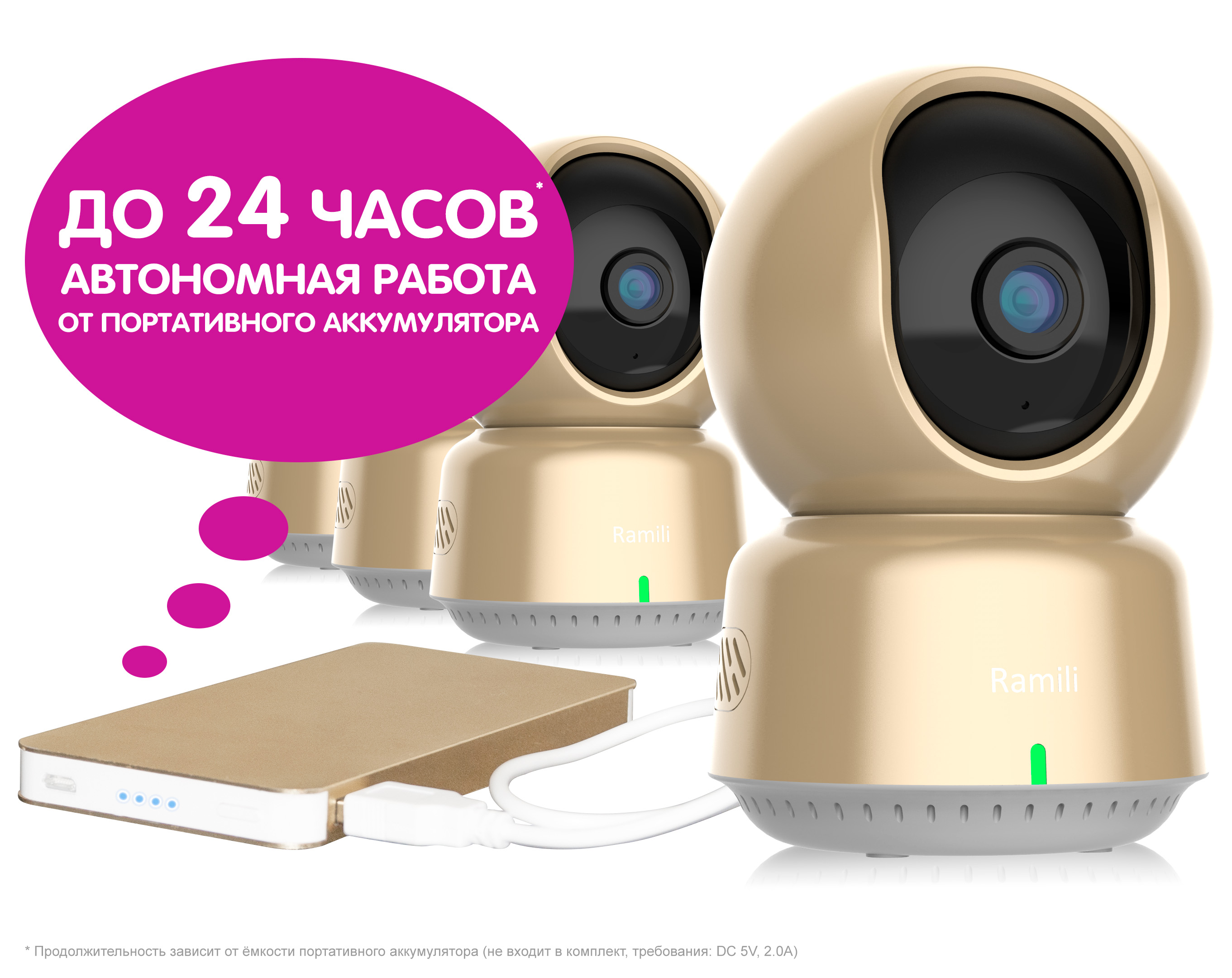 - Питание камеры (детского блока) возможно от сети или от обычного портативного аккумулятора (Power Bank, объём 10 000 mAh обеспечивает автономную работу камеры до 24 часов, продолжительность зависит от режима и интенсивности использования, разъём питания камеры USB Type-C, для подключения к портативному аккумулятору можно использовать кабель от адаптера питания из комплекта).