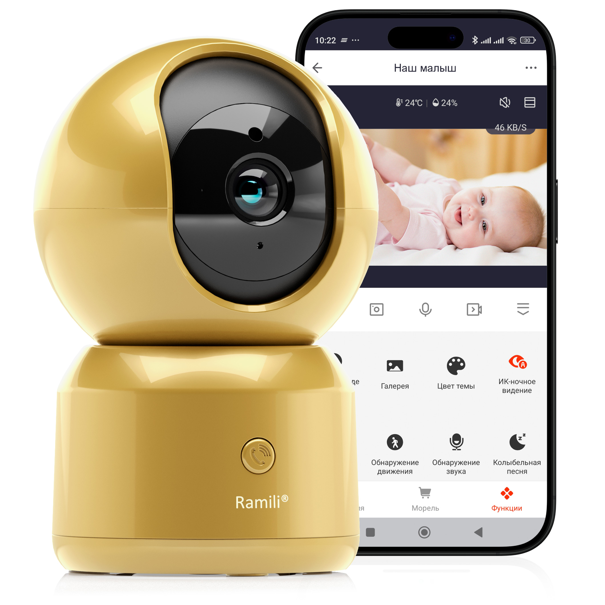 Цифровая видеоняня Ramili Baby RV1500CGOLD является поворотной камерой, которую легко настроить и дистанционно управлять ею посредством приложения на мобильном устройстве или планшете. Подключившись к домашнему Wi-Fi, эта камера станет доступной исключительно вам через интернет независимо от расстояния до дома. Устройство можно дополнительно приобрести в качестве второй камеры для видеоняни Ramili Baby RV1500GOLD, так как оно абсолютно аналогична основной камере комплекта. Она круглосуточно следит за вашим ребёнком, фиксируя активность, звуки плача и температуру помещения. При появлении звуков или движений система отправляет уведомление на смартфон, если устройство подключено к вашей домашней беспроводной сети. Благодаря функции двусторонней аудиосвязи родители имеют возможность успокаивать ребёнка голосом даже издалека. Также предусмотрена запись видео и аудиосигнала на встроенную карту памяти. Комплект включает гибкий монопод-крепление, позволяющее установить камеру практически на любые предметы, включая мебель.
