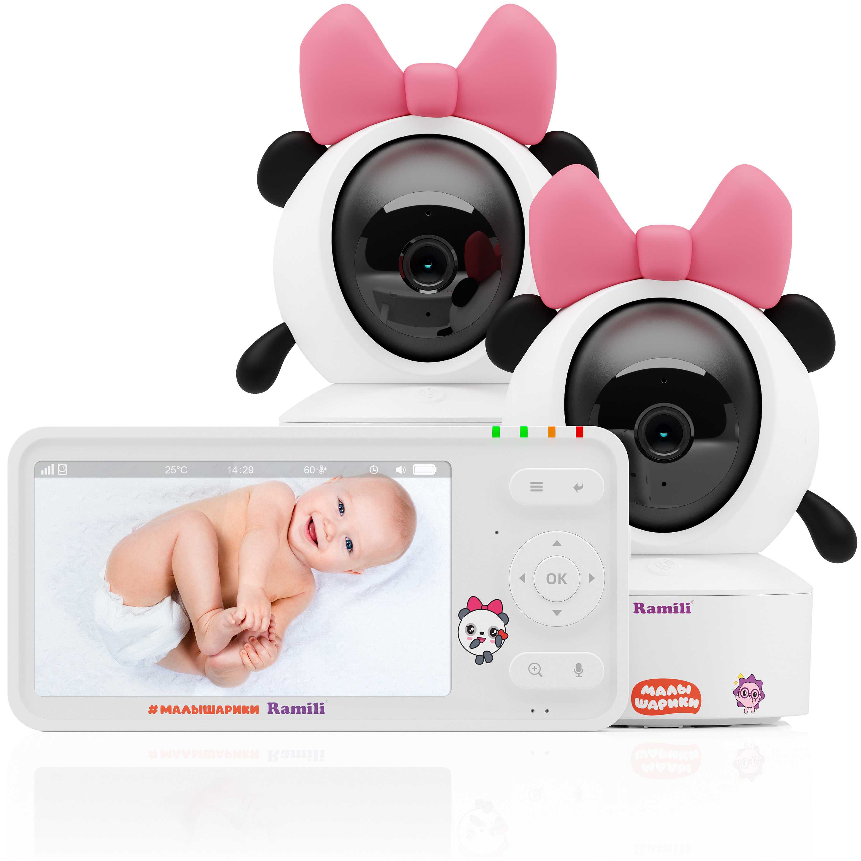 В наборе две камеры и родительский блок. Дизайн этой видеоняни Ramili Baby RV700X2PANDA выполнен по мотивам серии популярных мультфильмов для самых маленьких зрителей – Малышарики. Уникальный и забавный дизайн камеры порадует малыша и отлично впишется в интерьер любой детской комнаты.